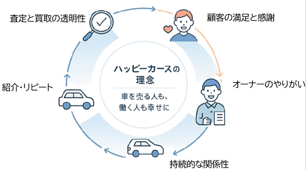 車の売買という生活に最も近い取引を媒介に、働く人が時間を取り戻し、生活者が納得して意思決定し、その信頼が地域と社会へ連鎖していく。ハッピーカーズは、希望を語るのではなく、希望が循環する構造そのものを設計している。