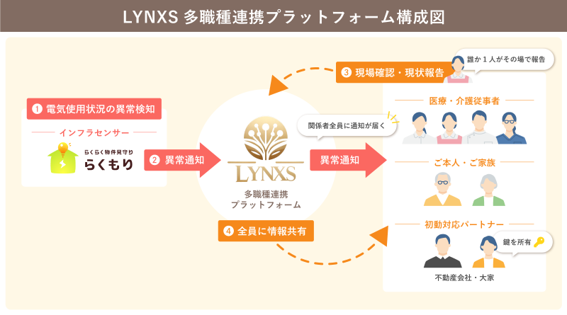 今回の提携では、LYNXSが提供する多職種連携プラットフォームと、R65が展開する電力使用量モニタリング型見守りサービス「らくもり」を連動させる。