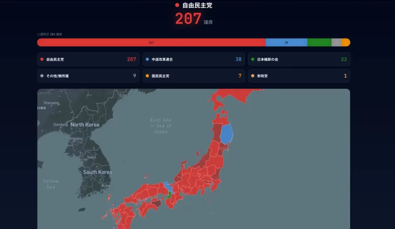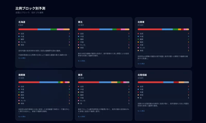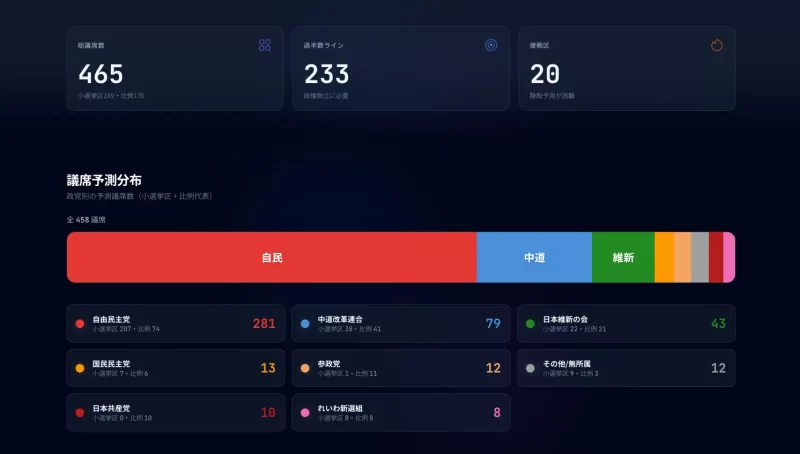 予測データはリアルタイムで更新され、世論動向や選挙期間中の情勢変化を反映する。注目区や競り合い構造、終盤に向けた変化の兆しなどを、数値と指標で把握できる点は、従来の報道や解説とは異なる角度を提供する。